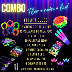 Combo de cotillon fluo + neon + led con 111 articulos.